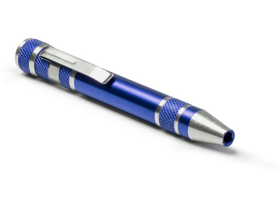 Алюминиевый мультитул в форме ручки. В комплекте 8 головок бит