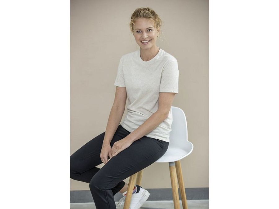 Воротник с обтачкой из основной ткани и узкая двойная игольная строчка обеспечивают долговечность, сохраняя при этом безупречный вид. Трикотажное полотно гладкого переплетения плотностью 160 г/м², изготовленное из переработанного хлопка и переработанного полиэстера, обеспечивает комфорт и воздухопроницаемость.