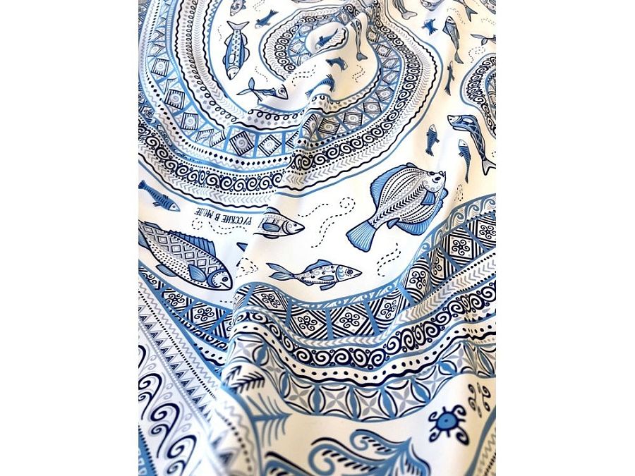 Платок из коллекции бренда "Русские в моде" посвящён уникальному искусству этой росписи. Изображения спиралевидных орнаментов в виде волн, елочек, рыбок украшают дизайн. Все это означает плодородие стихий земли и воды, энергию солнца, богатство и процветание.