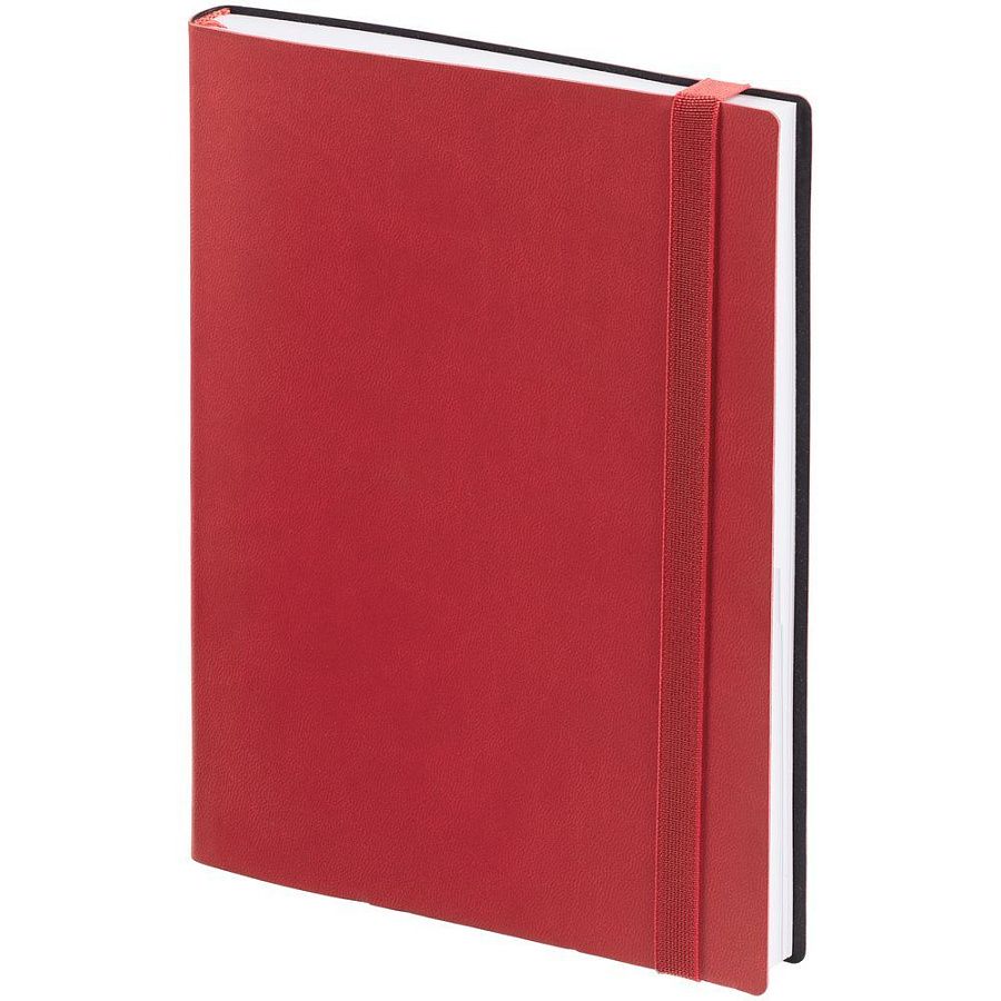 Ежедневник с гибкой обложкой выполнен из материала Latte, красный РР, и дополнен резинкой шириной 1 см, капталом и ляссе красного цвета.