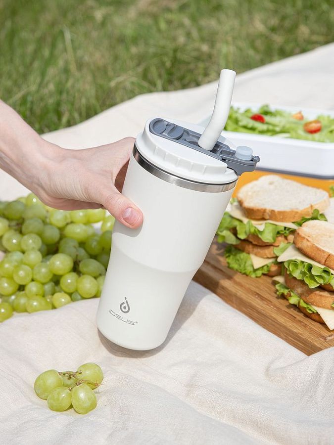 • 2 крышки в комплекте: одна на 100% герметичная с механизмом блокировки отверстия для питья, вторая — с отверстием для трубочки