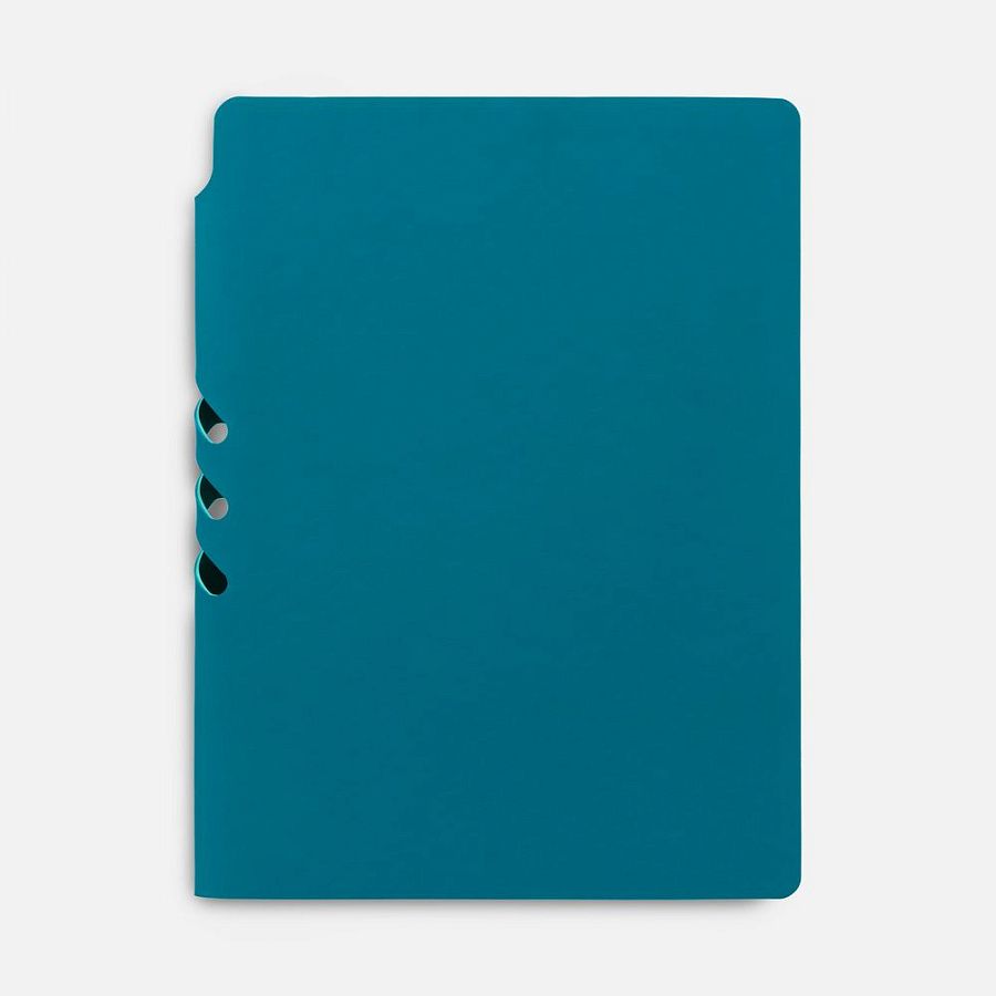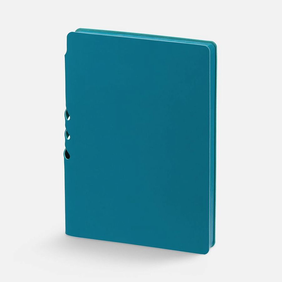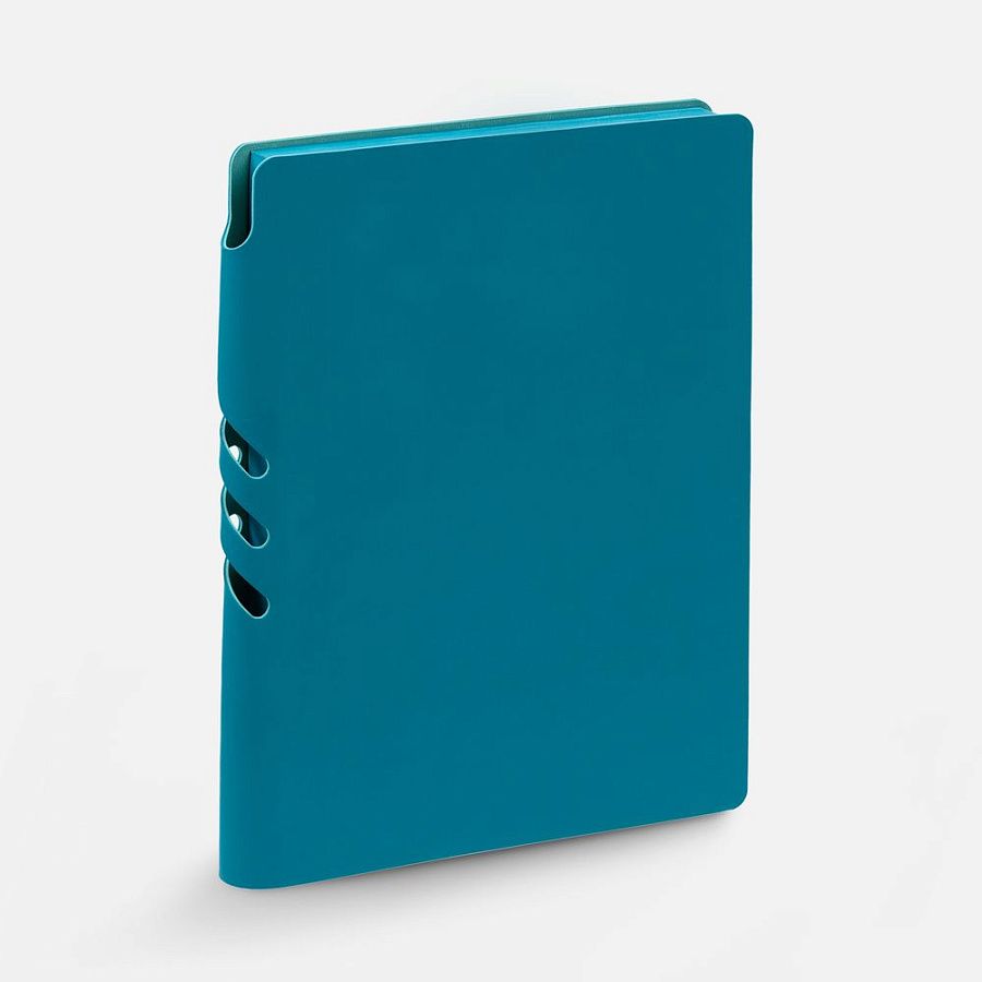 Гибкая обложка выполнена из материала Soft Touch, цвет морской волны II и Latte, цвет морской волны II (внутренняя часть обложки). Внутри корешка — специальное место для крепления ручки размером до 15х1 см.