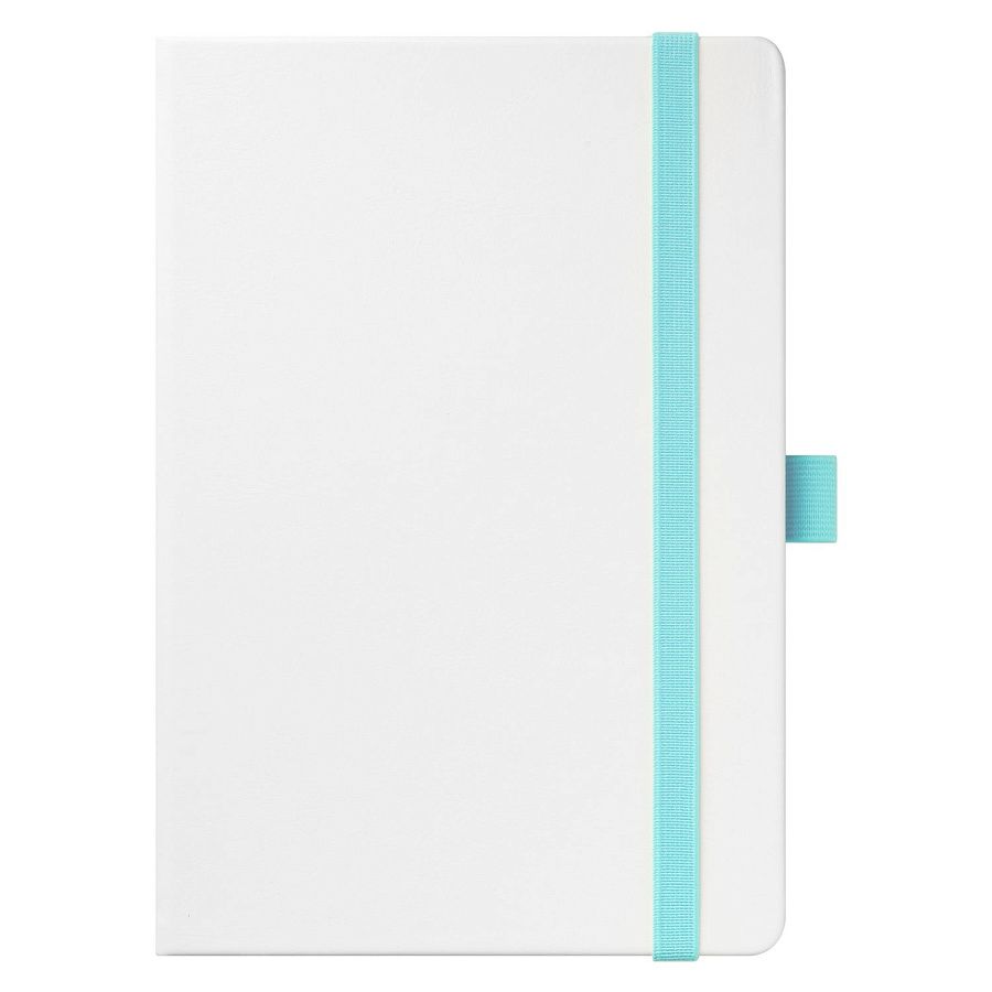 Недатированный ежедневник выполнен в жесткой обложке из искусственной кожи со скругленными уголками. Переплетный материал гладкий, с легкой естественной паутинкой морщин, имеет полуглянцевый блеск. Цвет – чистый белый. Бирюзовые матовые форзац и нахзац, а также бирюзовый срез блока создают оригинальный динамичный цветовой ансамбль и подчеркивают белизну обложки. Страницы светло-кремового цвета, из гладкого офсета, слегка шелковистые, со скругленными уголками. Добавляют изделию мягкую комфортную теплоту. Двойное атласное ляссе составлено из бирюзовой и белой лент. Каждая шириной 6 мм, имеет легкий блеск. Вертикальная фиксирующая резинка прочная, надежная и удобная, в тон срезу. Есть петелька для ручки в тон резинки. Карман на заднем форзаце.