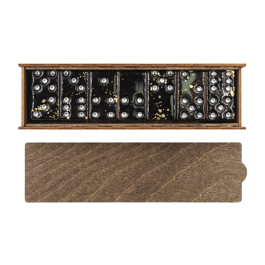 Домино WIN-WIN в стильном деревянном пенале, входит в коллекцию "Русские сезоны".Кости глянцевого черного цвета из дерева и ювелирной смолы с золотыми вкраплениями и стразами произведены вручную. Элегантный и лаконичный дизайн.