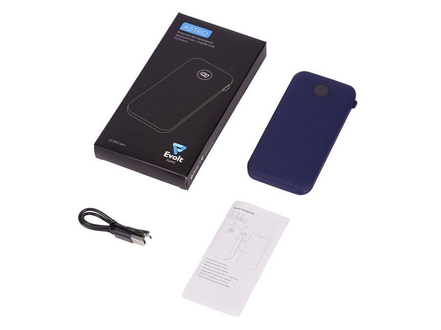 Портативный аккумулятор включает в себя всё самое необходимое: стильный дизайн и удобство использования. На фронтальной стороне с цифровым индикатором заряда можно выгравировать яркий светящийся логотип. На обратной стороне с беспроводной зарядкой (5 Вт) для смартфонов можно сделать УФ-лого. Зарядный кабель 2-в-1 (USB-С и Lightning) крепится по периметру корпуса. Покрытие soft-touch.