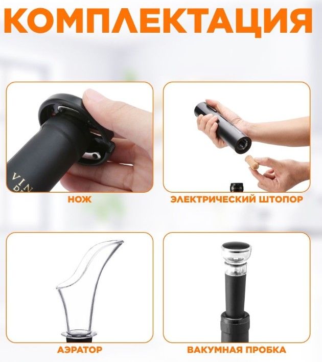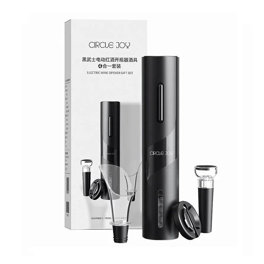 Подарочный винный набор Circle Joy Black 4 в 1 привлекает своей функциональностью и внешним видом. Электрический штопор на батарейках (идут в комплекте), выполнен из нержавеющей стали с мощным мотором. Вы без лишних усилий, используя винный штопор Circle Joy , откроете за 6 секунд бутылку с разными видами пробки: синтетической или деревянной. Многофункциональный нож для удобного снятия фольги на бутылке удобно фиксируется в основании штопора. Благодаря вакуумной пробке для вина из прочного акрила и качественного силикона, спустя 7 дней аромат и вкус вина в открытой бутылке останется таким же свежим и насыщенным!Универсальный размер аэратора с косым срезом поможет аккуратно разлить вино. С винным набором 4в1 вы никогда больше не захотите пользоваться традиционным штопором.Используя штопор электрический, открывайте любую бутылку быстро и легко!Набор для вина Circle Joy - отличный подарок себе и близким на Новый Год, день рождения и просто так!