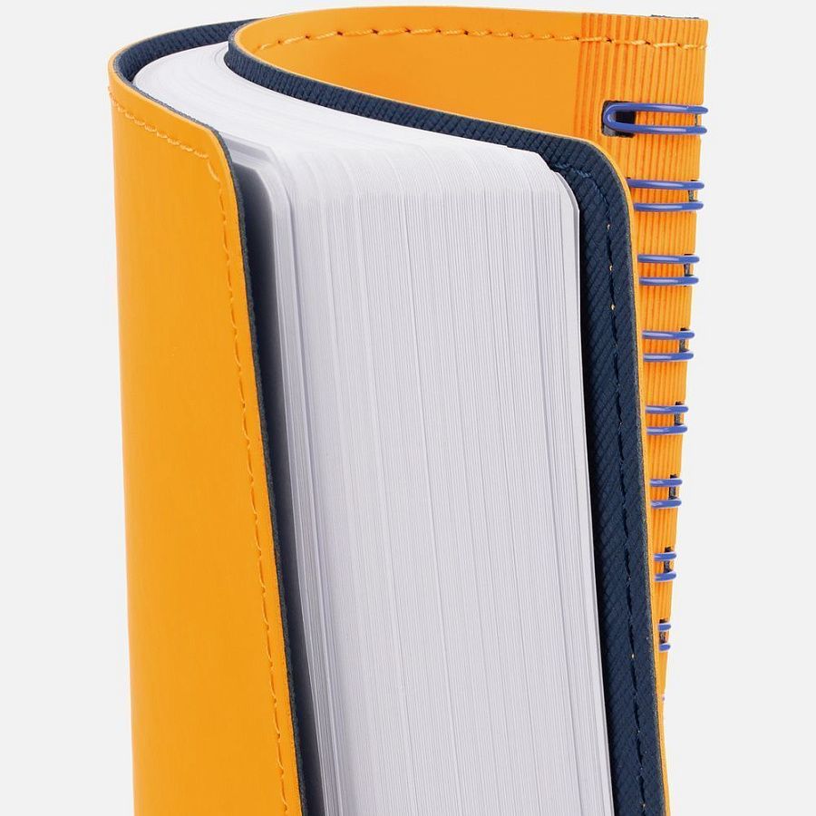 Ежедневник с гибкой обложкой, выполнен из материалов Soft Touch, желтый КК и Nice Touch, темно-синий ХХ.