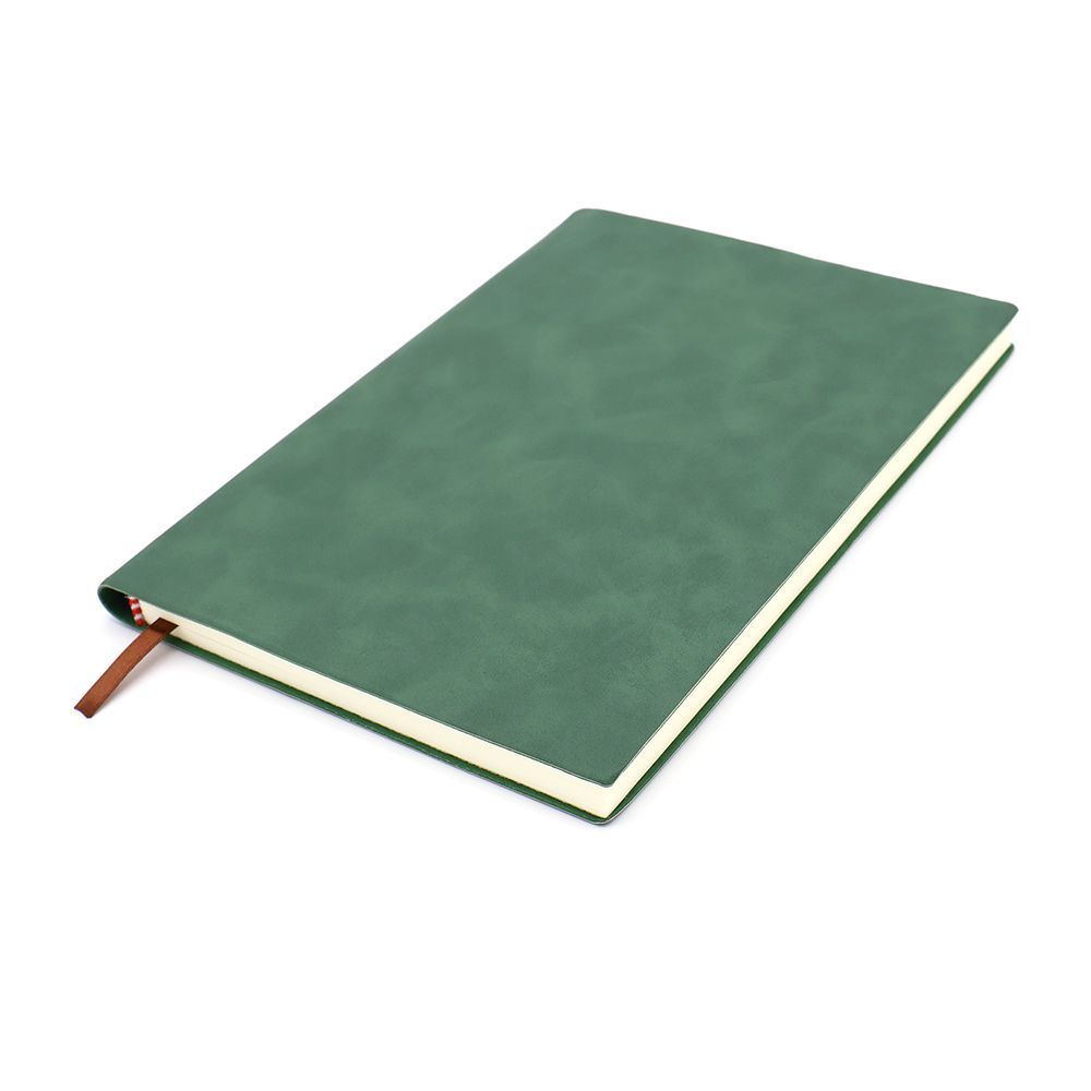 Блокнот формата А5 в мягкой обложке из искусственной кожи. Материал обложки — полиуретан. Текстура — гладкая с эмитацией натуральной кожи. Для удобства переноски ручки в корешке блокнота присутствует ниша, к которой ручка крепится за клип.