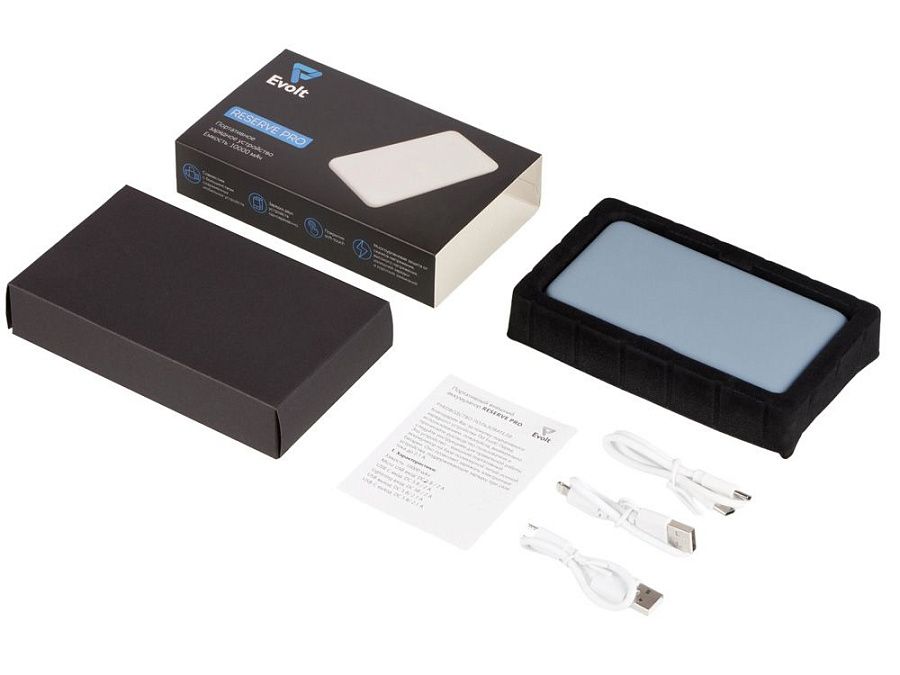 Универсальный внешний аккумулятор "Reserve Pro" обладает надежной литий-полимерной батареей класса "А" емкостью 10000 мАч и размерами меньше современного смартфона. Корпус выполнен из качественного ABS-пластика с анти скользящим приятным покрытием soft-touch. В корпусе находятся три самых популярных входных разъема (USB Type C, micro USB, Lightning), что значит можно использовать один кабель для зарядки и повербанка, и Вашего смартфона. Разъем USB-C также работает на выход, поэтому повербанк может заряжать до 2-х устройств одновременно. В комплекте кабели micro USB, Lightning и симметричный USB-C - USB-C. Многоуровневая система защиты от скачков напряжения, короткого замыкания, перегрева и перезаряда.