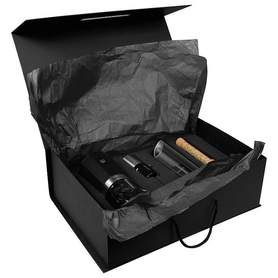Цвет коробки может быть заменён по желанию заказчика. А так же мельница для кофе и вспениватель могут быть заменены на аналогичные, однако с золотыми элементами (арт. CJ-EG05 - мельница, арт. CJ-EMF05 - вспениватель).