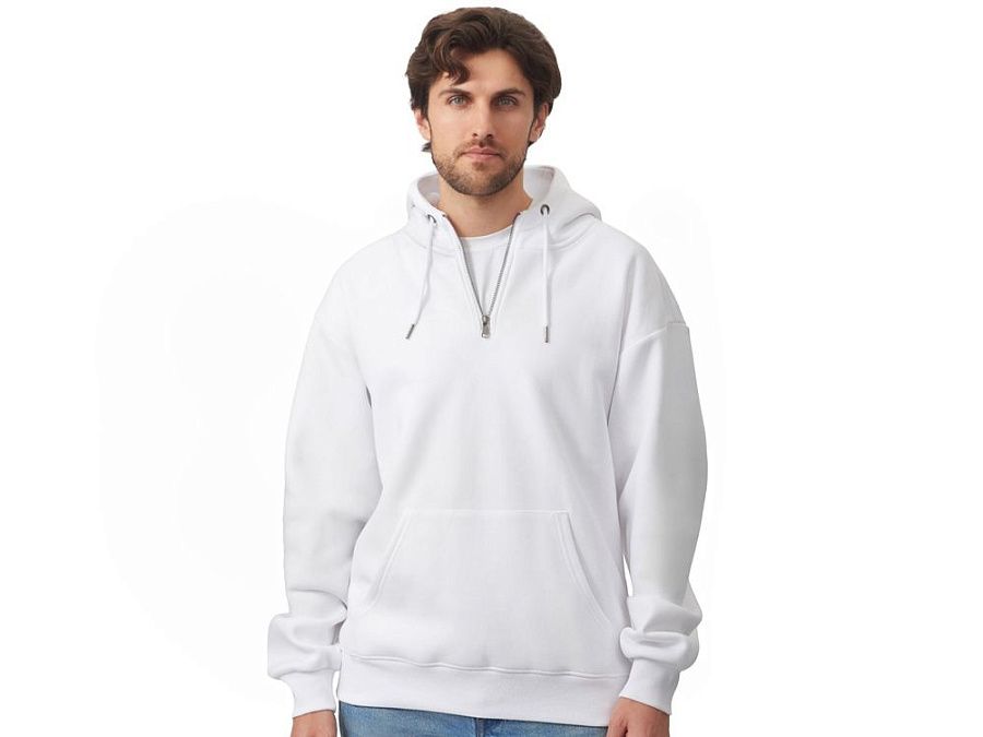 Худи с капюшоном ворот на молнии. Шнур в капюшоне с металлическими наконечниками. Отделка горловины спинки внутри тесьмой, Риб 2х2 по низу изделия и манжетам. Удобный карман кенгуру.