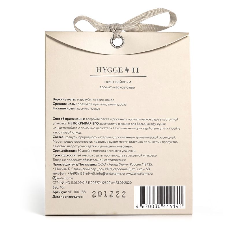 Вскройте пакет и достаньте ароматическое саше в картонной упаковке. НЕ ВСКРЫВАЯ САШЕ, разместите в ящике для белья, шкафу, сумке или автомобиле с помощью держателя. По окончании срока действия утилизируйте как бытовой отход.