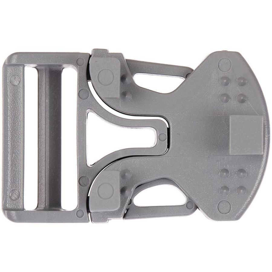 Особенность этой пряжки в том, что она состоит из 3 частей, две из которых крепятся напрямую на изделие, и для их установки необходим специальный инструмент. Третья деталь фиксируется на стропе.
