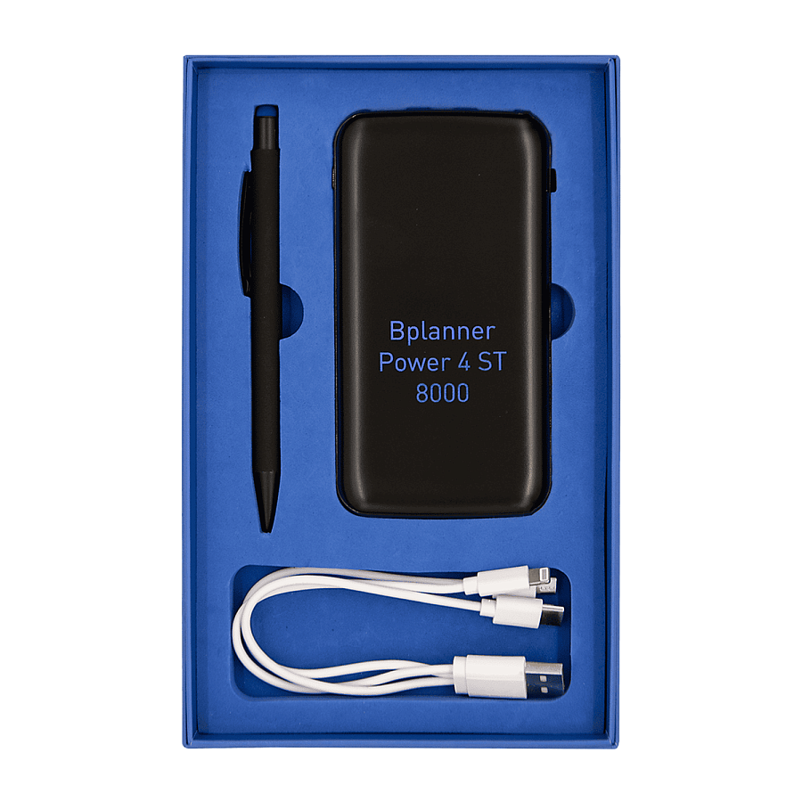 Набор Bplanner Power– отличный вариант для welcome pack! Он содержит все самое необходимое: емкий внешний аккумуляторBplanner, металлическую ручку и подарочную коробку с цветным ложементом.