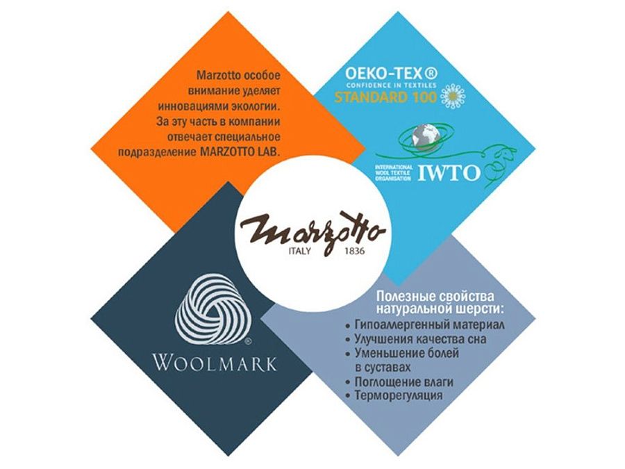 О Бренде: MARZOTTO GROUP была создана в 1836 году в Италии. Компания владеет 11-ю заводами в Италии и 5-ю за рубежом. Выполняет заказы для многих известных брендов (Burberry, Polo Ralph Lauren, Trussardi и др.)MARZOTTO GROUP особое внимание уделяет инновациям и экологии. За эту часть в компании отвечает специальное подразделение MARZOTTO LAB. Например, лаборатория доказывает, что натуральная шерсть лучший друг здоровья человека, так как это единственный материал, способный превращать обычный сон в настоящий здоровый отдых.