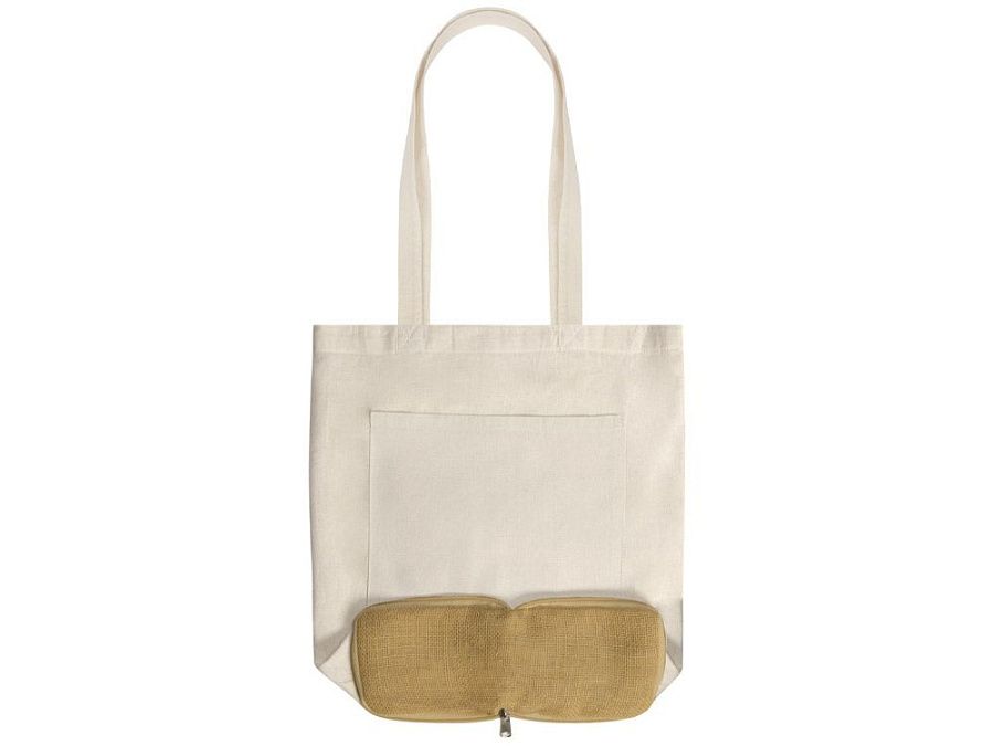 Складная сумка из хлопка с дном из джута. Снаружи большой вместительный карман. В сложенном виде закрывается на молнию.