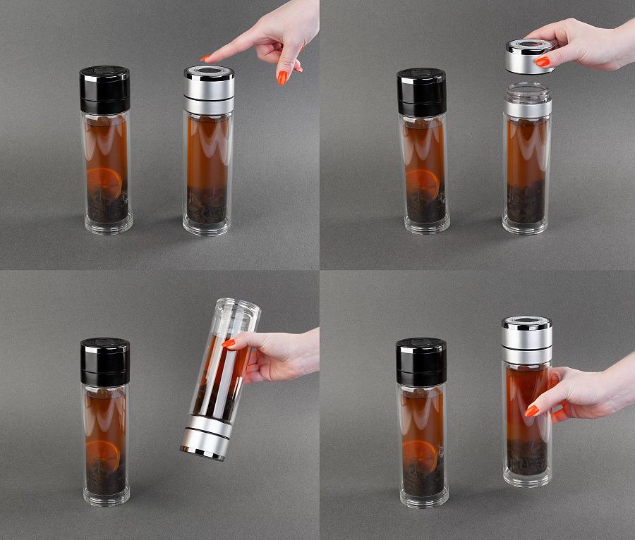 Заварочный термос "Press" 400 мл с удобной крышкой, которая открывается нажатием кнопки, для закрытия достаточно слегка надавить на нее до щелчка. Сито из 304 стали для фильтрации содержимого. Двустенная колба из боросиликатного стекла идеально подходит для горячих напитков, внешняя стенка не нагревается, комфортно держать в руках. Стекло не имеет посторонних запахов, напитки сохраняют вкус.