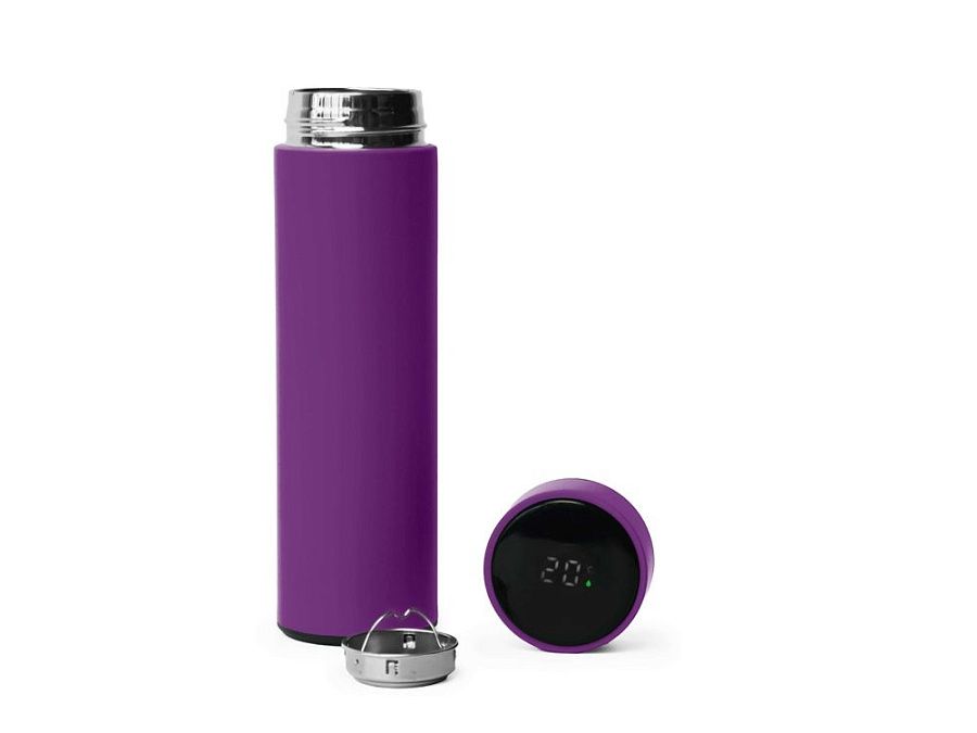 Термос из нержавеющей стали, покрытый цветным soft touch, с крышкой, в которой встроен термометр и LED дисплей, показывающий температуру внутри термоса. Объем: 500 мл. Упаковка: каждый термос в крафт коробке.