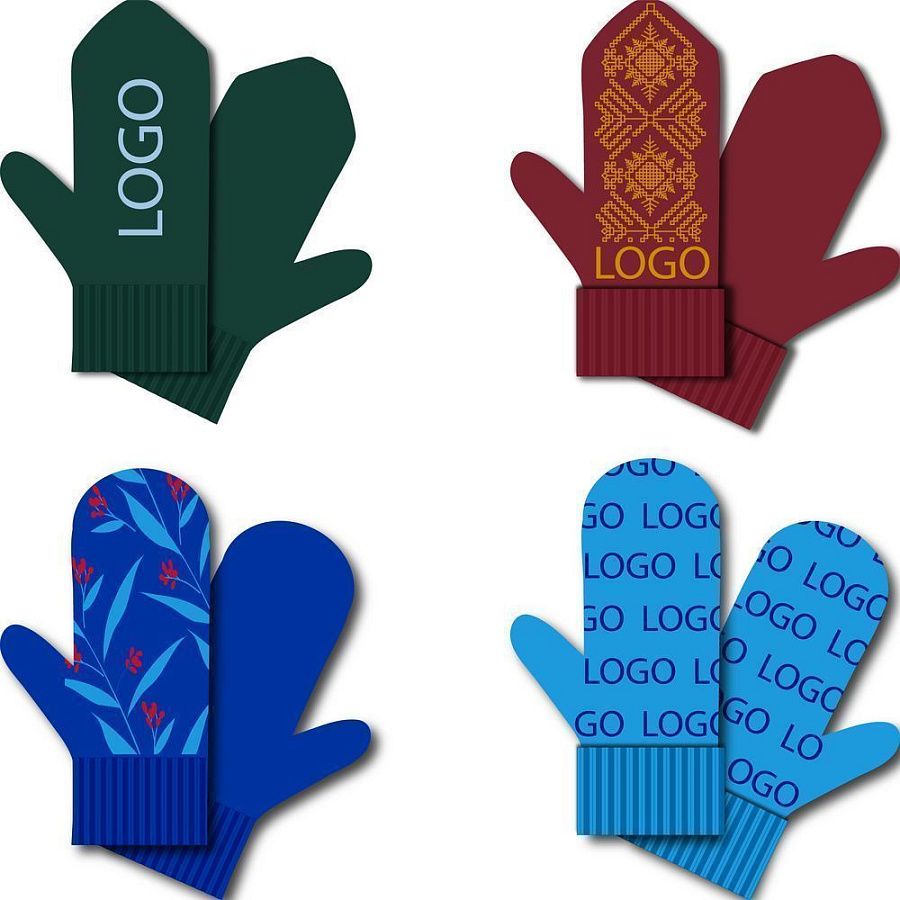 Варежки с вывязанным логотипом и индивидуальным рисунком в фирменной цветовой гамме.