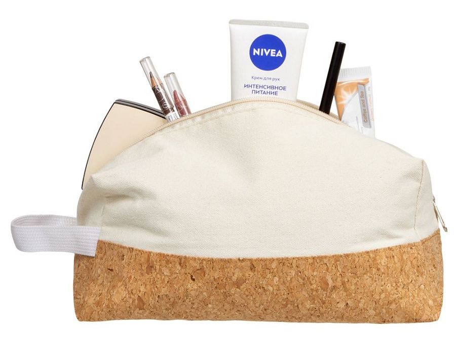Большой вместительный несессер на молнии изготовлен из натуральных материалов - хлопка и пробки.