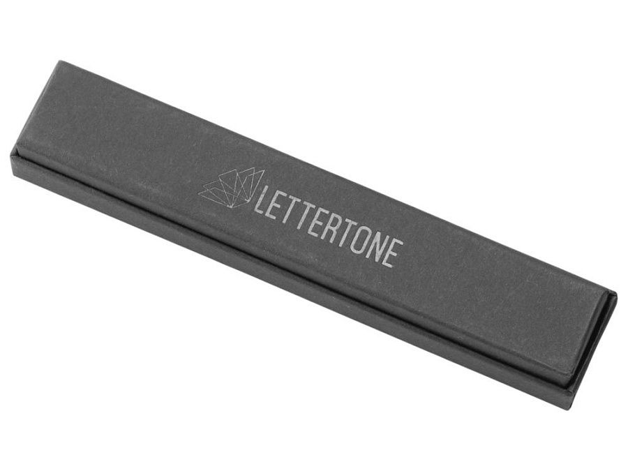 Ручка упакована в чёрный матовый футляр с логотипом бренда Lettertone на дне.