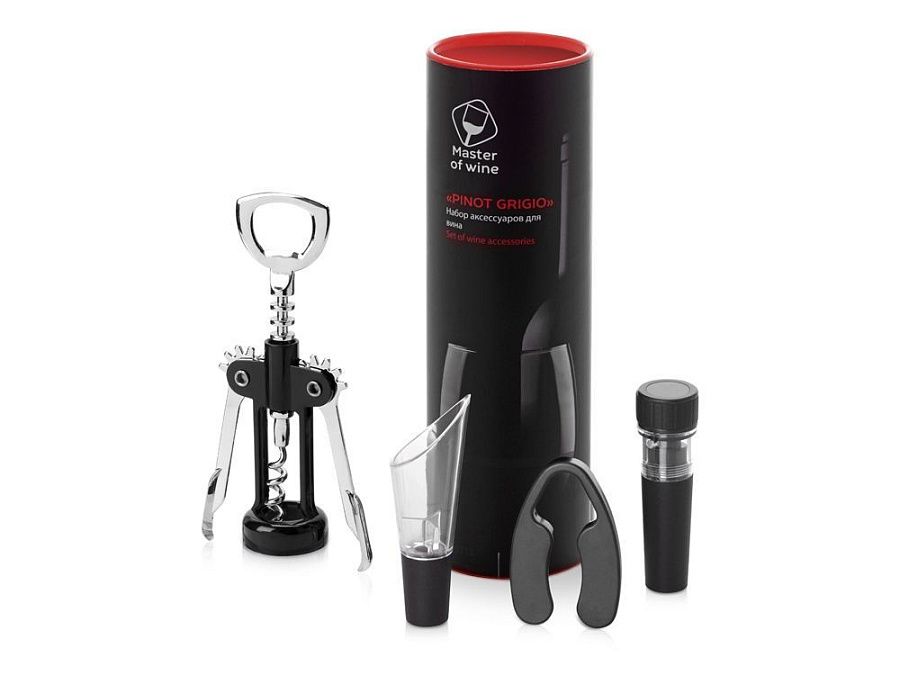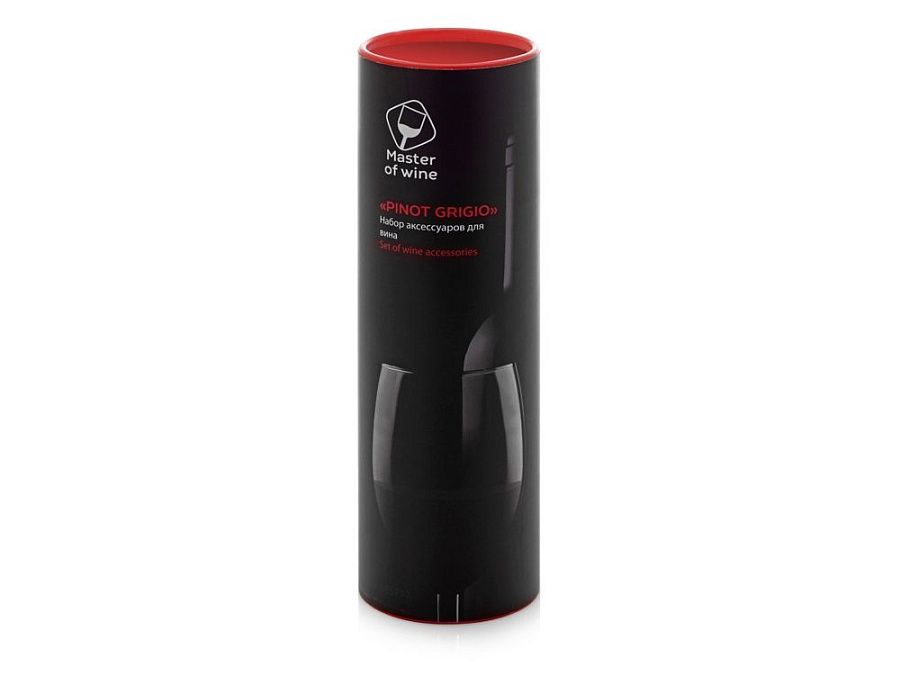 В винном наборе "Pinot Grigio" собрано все, что необходимо для откупоривания, подачи и длительного хранения вина. Аксессуары поставляются в эффектном красном тубусе и брендированном шубере.