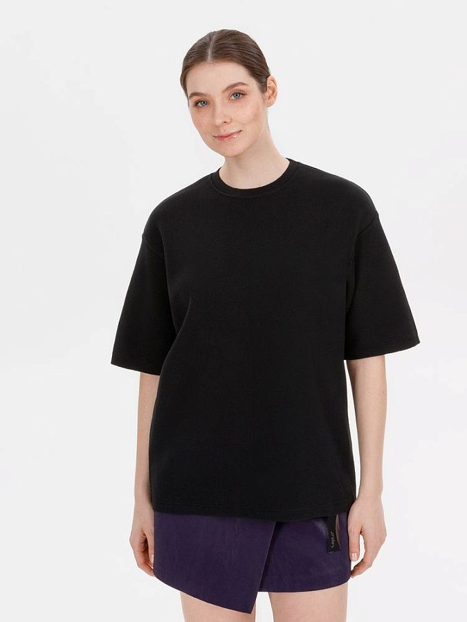 Siluetti Volumica — плотный вязаный джемпер-футболка прямого кроя с круглым вырезом и спущенной линией плеча. Фирменная бирка из силиконовой ленты станет интересной деталью, привлекающей внимание на фоне общей лаконичности модели.