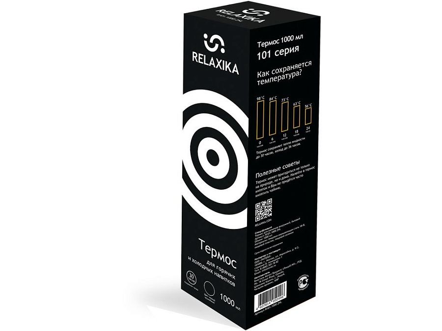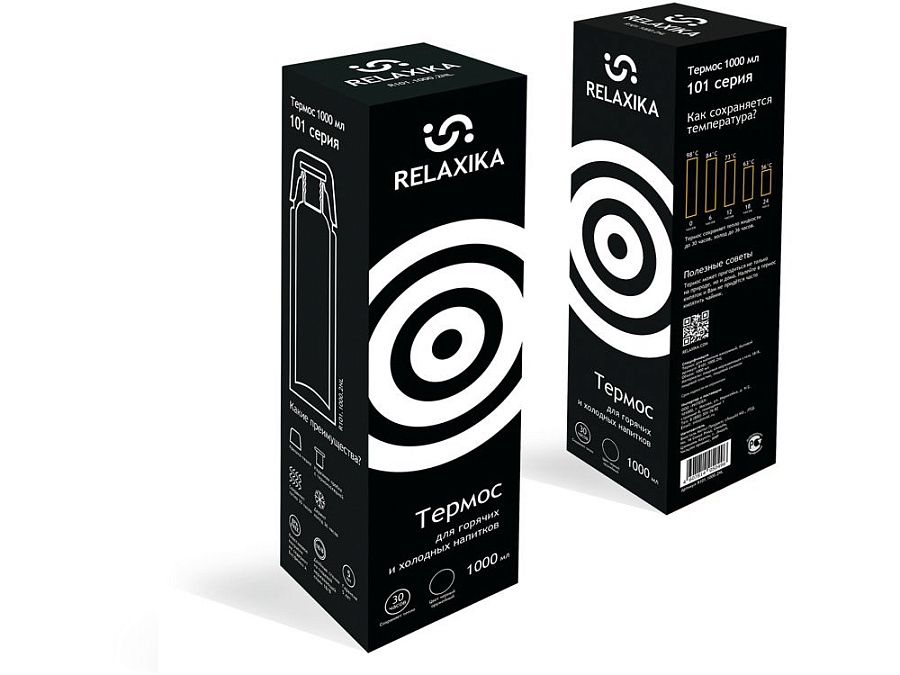 Классический термос Relaxika черного цвета с высокими показателями удержания температуры напитка для походов, путешествий, спорта и ежедневного использования. Прочные двойные стенки из высококачественной нержавеющей стали 18/8 с вакуумной изоляцией гарантируют, что ваш напиток останется холодным в течение 36 часов и горячим до 30 часов. Этот материал не только прочен, но и гигиеничен, не выделяет никаких вредных для здоровья веществ. Ваши напитки сохраняет естественный вкус и не приобретут посторонний запах.