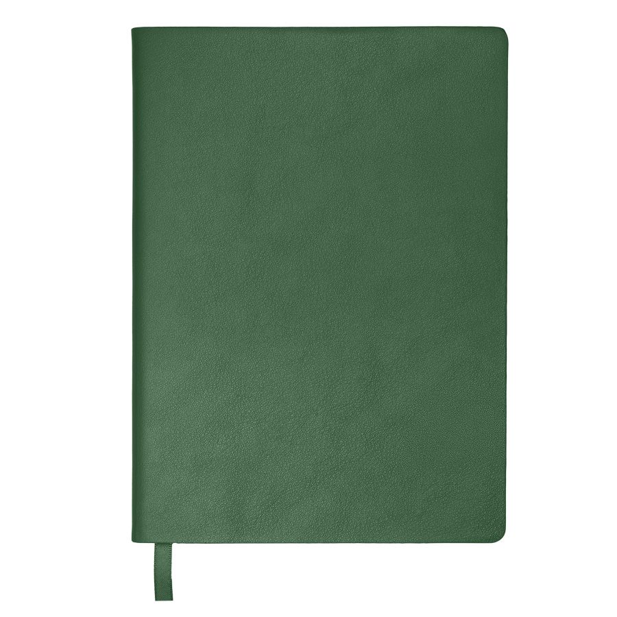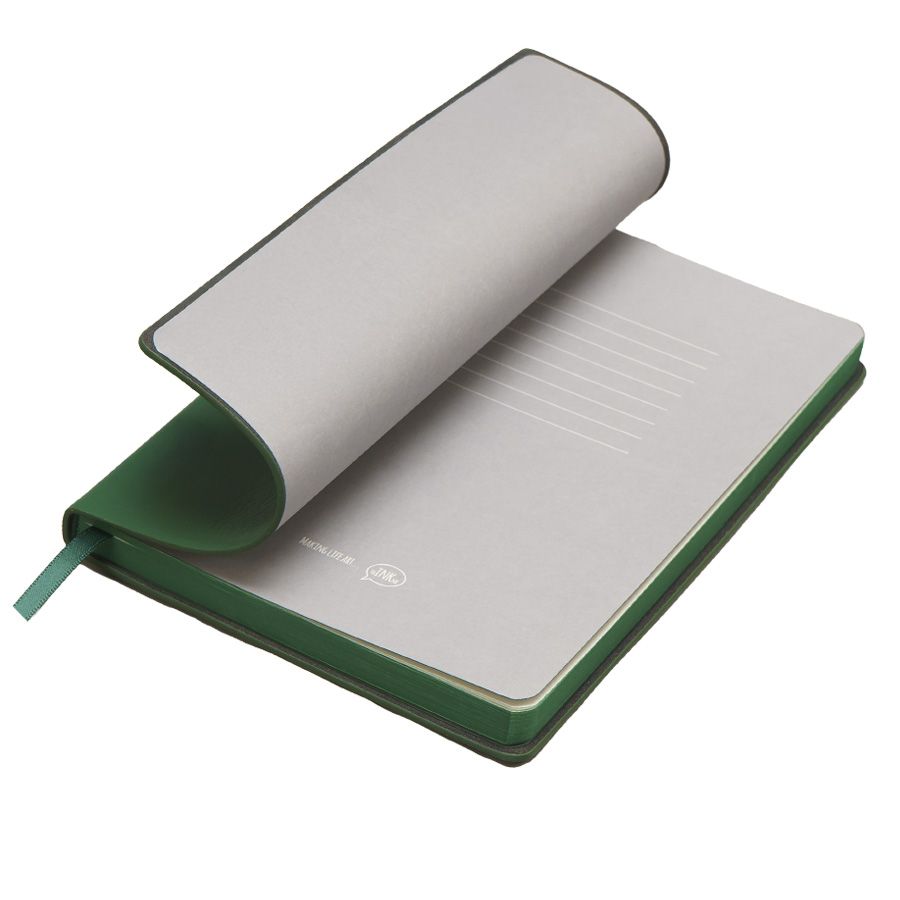 Бизнес-блокнот LADYЦвет обложки зеленый, близкий к Pantone 343CРазмер 150*210 мм, переплет мягкийОбложка - не термоактивный PU с эффектом кожи наппаБлок в клетку, скругленные углыСрез в цвет обложкиБумага кремовая, плотность 70 г м2Форзац нахцаз серый, близкий к Pantone 5 U Cool grey256 стр, перфорация на последних страницахЛяссе, 7 мм, в цвет обложкиУпаковка сливбокс + бумага