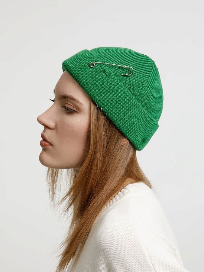 Однослойная шапка бини с рваным отворотом и металлическими аксессуарами для дерзких образов в любом возрасте. Яркий и запоминающийся акцент в стиле гранж.