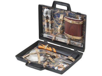 Все аксессуары упакованы в пластиковый кейс и надежно закреплены ремешками из натуральной кожи, что обеспечивает удобство транспортировки и сохранность содержимого.