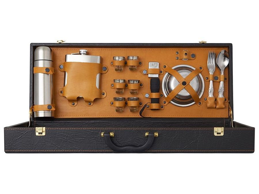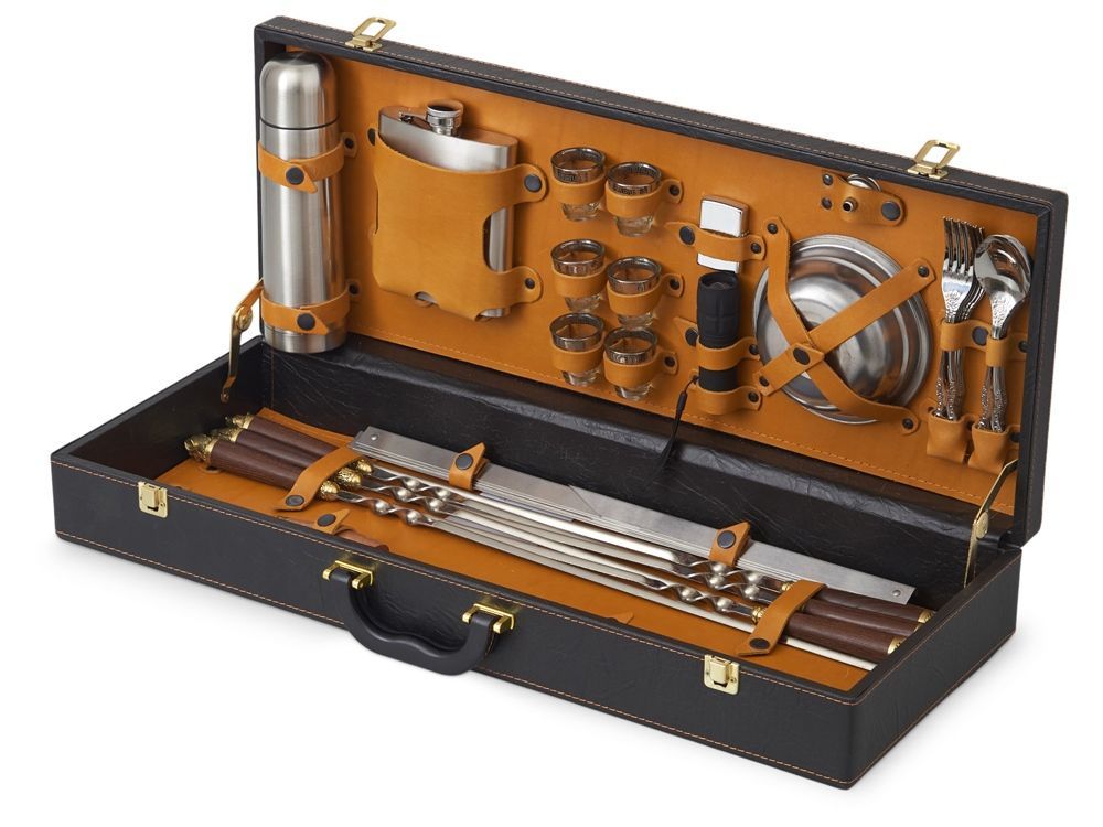 стопка- 6шт, термос, фляга, зажигалка, фонарь, тарелка-6шт, вилка-6шт, ложка-6шт, воронка, ножки для мангала-2шт, шампур-6шт, штопор, нож, нож Топорик