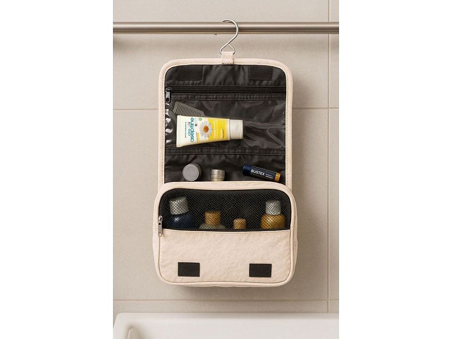 - прозрачный карман из ПВХ для флаконов с жидкостями, который легко очистить