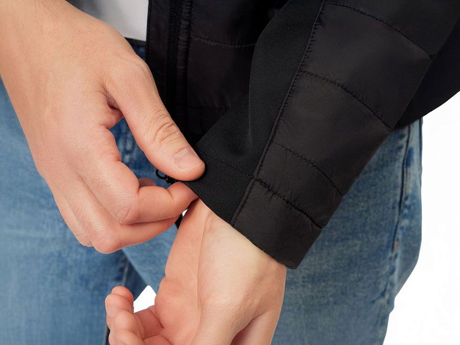 - гибридная конструкция из 2 видов материалов – софтшелл гарантирует ветронепроницаемость и легкость, а стеганные вставки добавляют утепления.