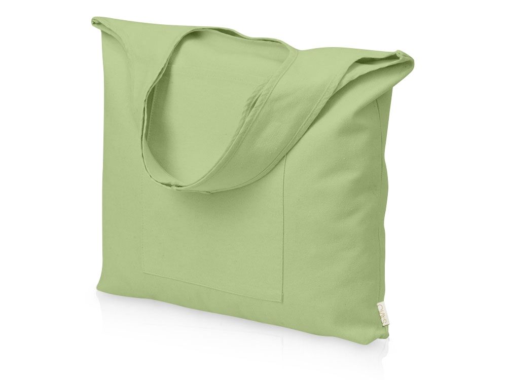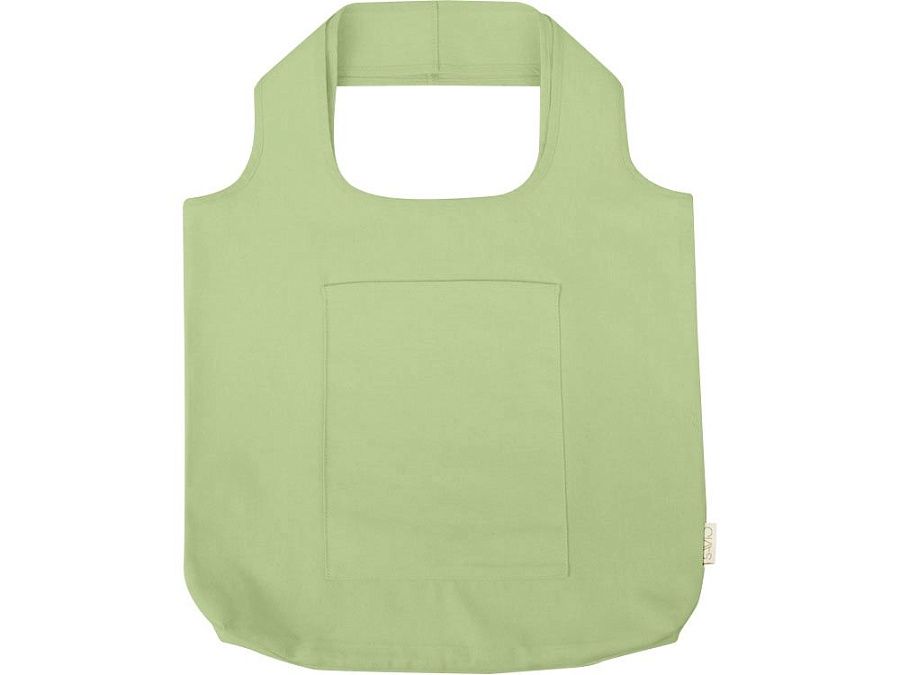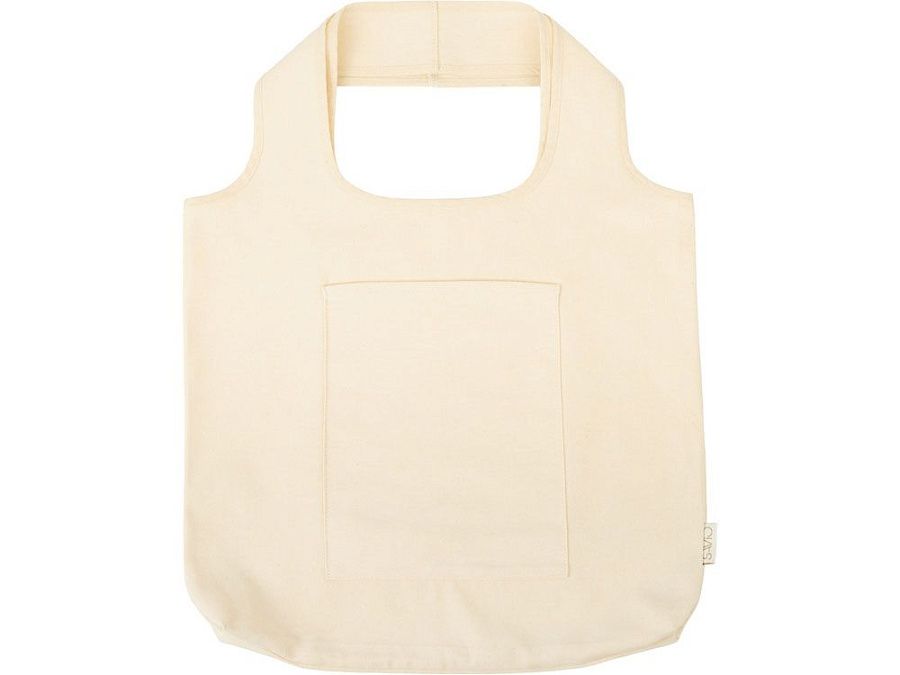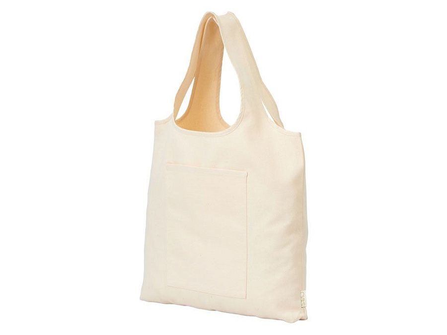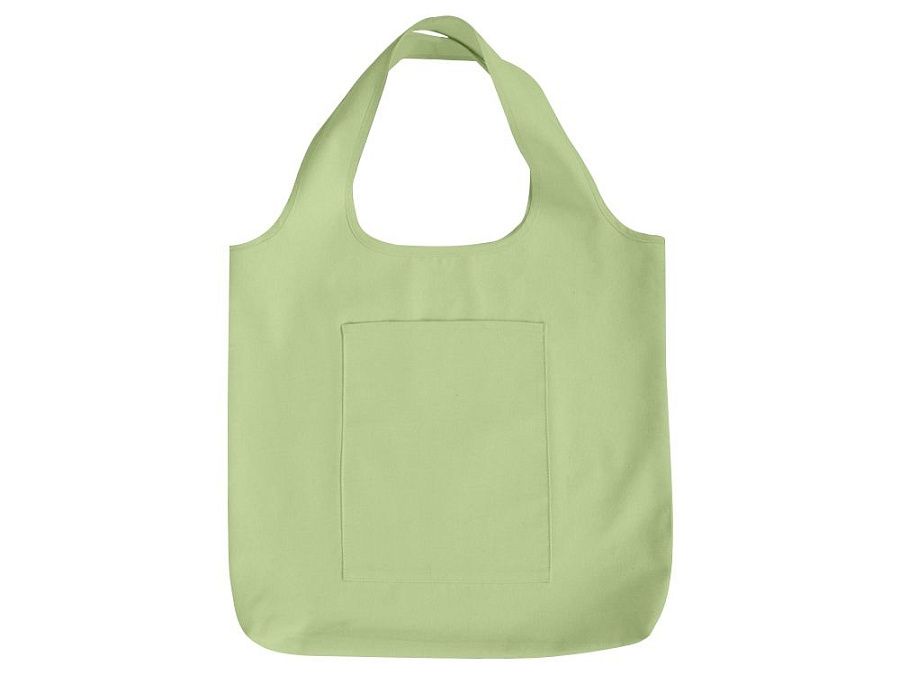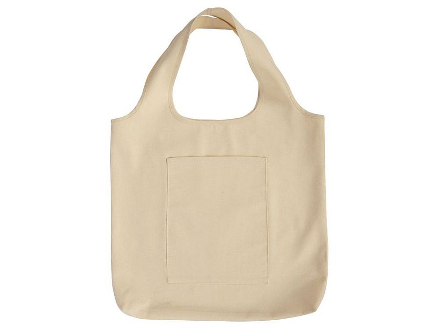 Вместительная сумка-шоппер из очень плотного переработанного хлопка с широкими лямками и большим наружным карманом 20 x 25 см спереди.