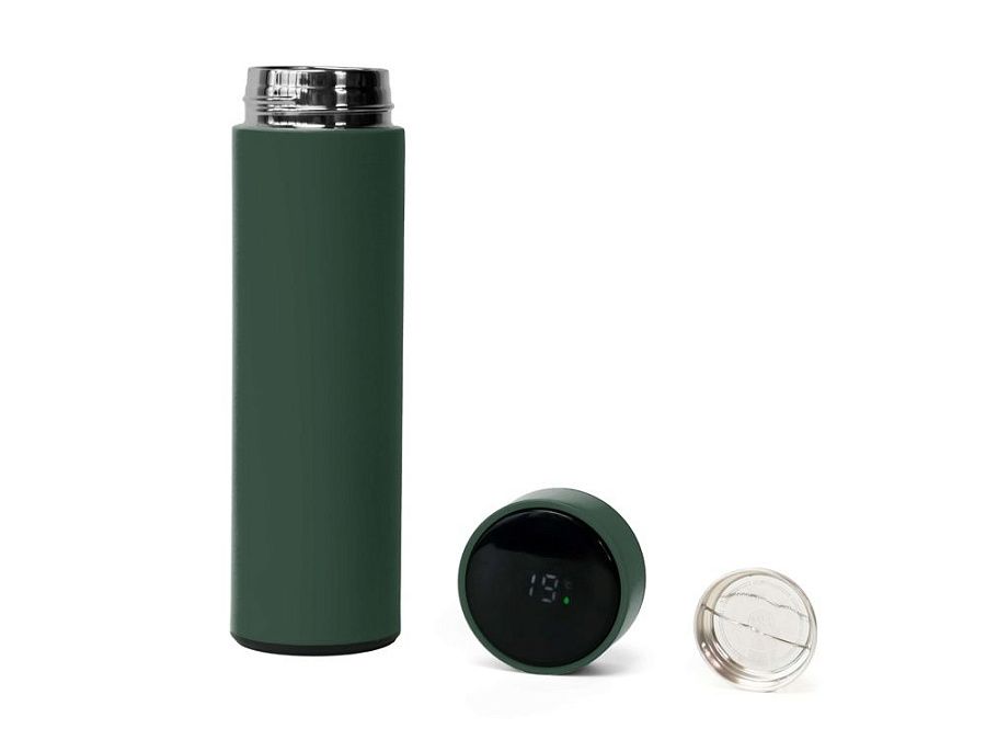 Термос выполнен из нержавеющей стали и покрыт цветным soft-touch покрытием. Его особенность — инновационная крышка со встроенным термометром и LED-дисплеем, который отображает температуру напитка внутри.