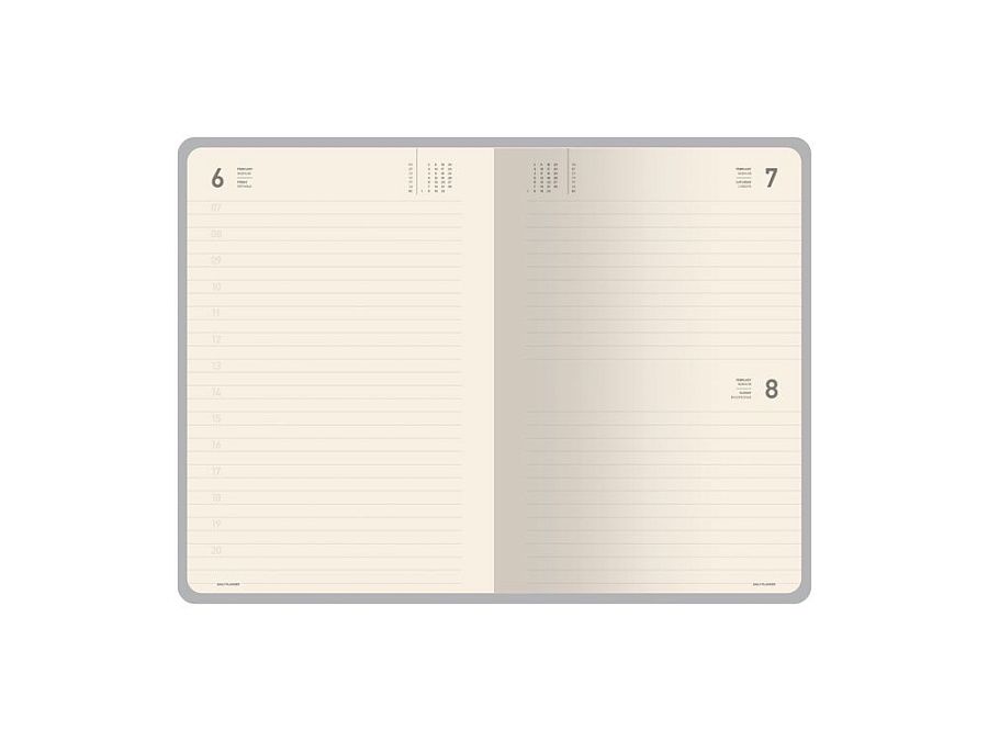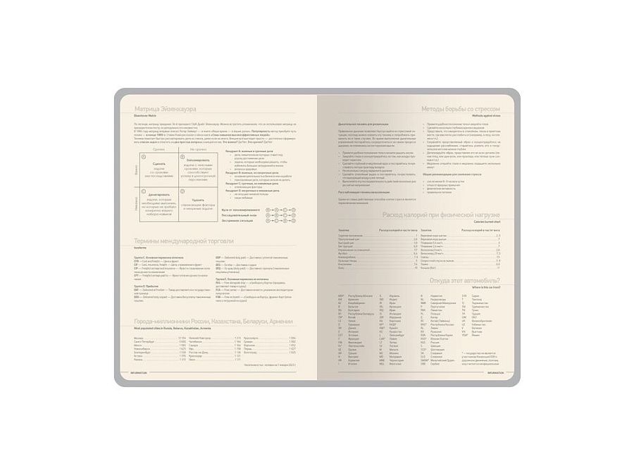 Твердая обложка из фактурной искусственной кожи, двойное ляссе и окрашенный обрез придают ему особый шарм. Блок из бежевой бумаги плотностью 70 г/кв.м содержит раздел для планирования, календарь и справочную информацию.