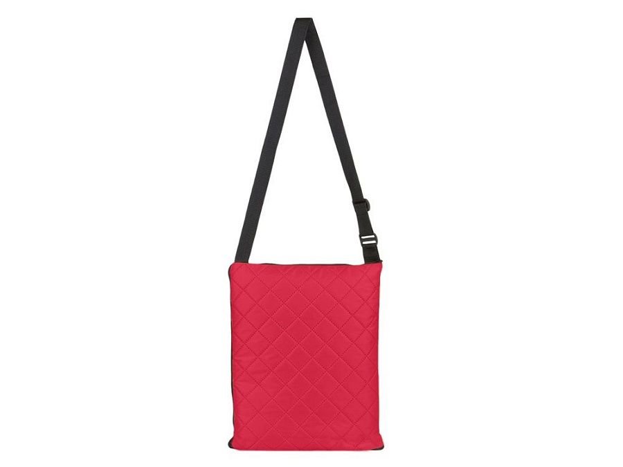Двухсторонний плед с водоотталкивающим покрытием с одной стороны и мягким флисом с другой. Складывается в сумку на плечо и фиксируется с помощью молнии. В собранном виде имеет регулируемый по длине ремень для переноски и наружный карман для мелочей.