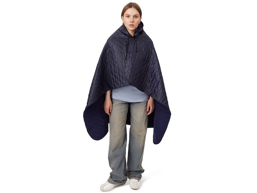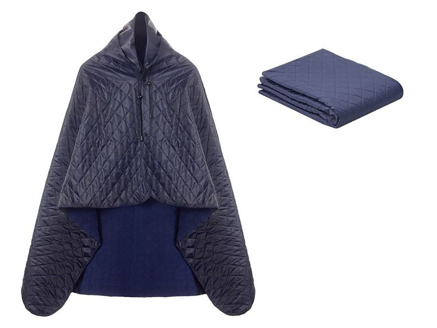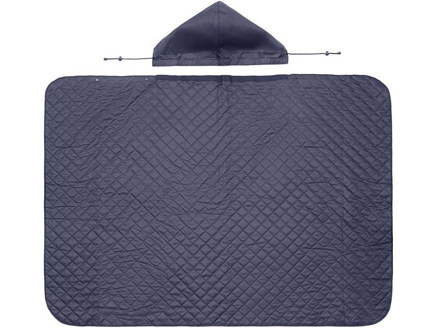 На внутренней стороне из флиса приятно и тепло сидеть, а наружная сторона из полиэстера с водоотталкивающим покрытием не позволяет пледу намокнуть или сильно испачкаться. Для больше удобства использования пледа во время дождя в комплекте идет капюшон, который фиксируется с помощью " липучки". Накинув плед на плечи, застегните его на кнопки вверху и наденьте капюшон. Вы не промокните во время неожиданного дождя!