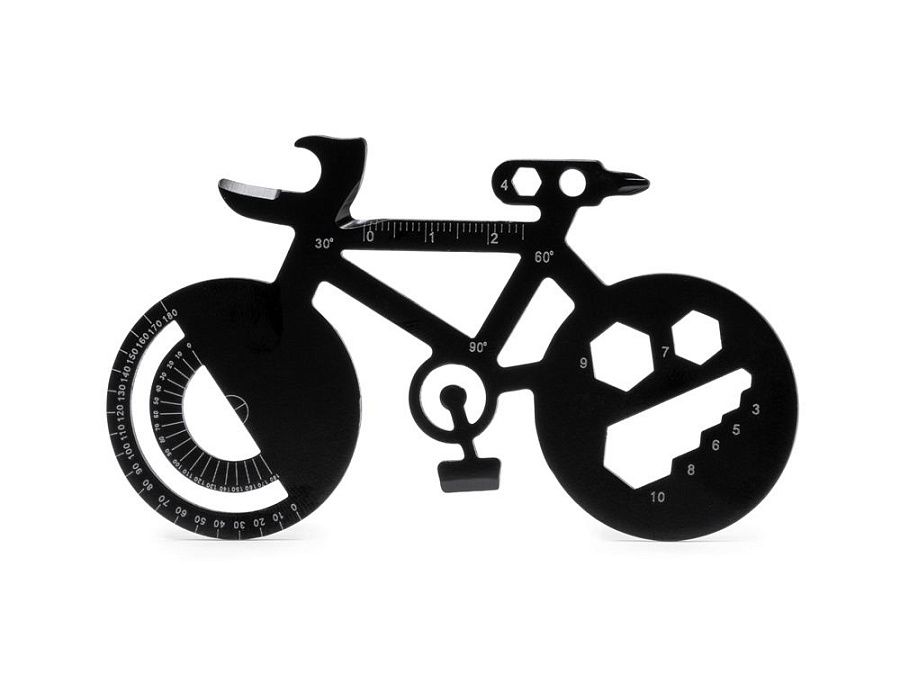 Многофункциональный инструмент из нержавеющей стали в форме велосипеда. 11 функций: открывалка для консервных банок, угловой транспортир, отвертки, гаечные ключи и линейки.