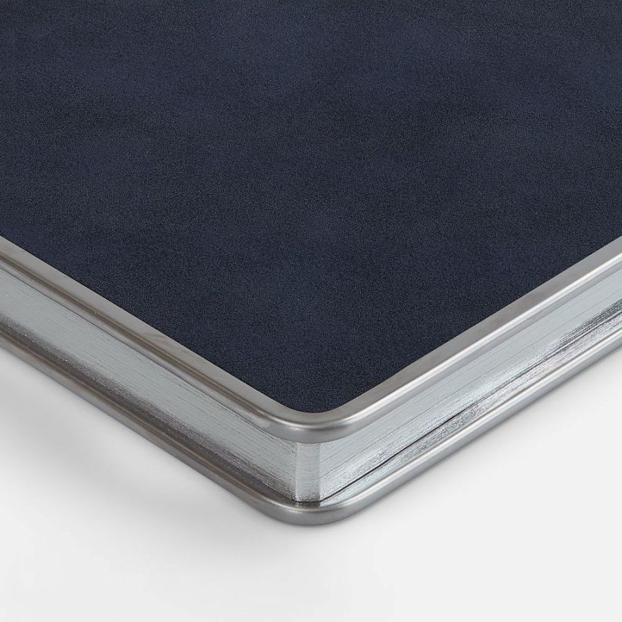 Ежедневник с твердой обложкой и серебристым обрезом блока. Выполнен из материала Nubuck, темно-синий ХХ, дополнен синим ляссе и металлическими рамками с двух сторон обложки.