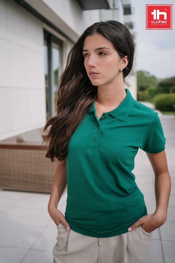 Женская рубашка-поло из смесовой ткани-пике. Полотно футболки упругое и гладкое благодаря обработке ферментами "enzyme wash" и сохраняет форму при стирке. Модель полуприлегающего силуэта. Благодаря манжете из риба 1х1 рукав смотрится очень аккуратно. Воротник также выполнен из риба 1х1, внутри ворота - укрепляющая тесьма по горловине. Планка с 3 пуговицами в тон изделия. запасная пуговица на ярлыке во внутреннем боковом шве.