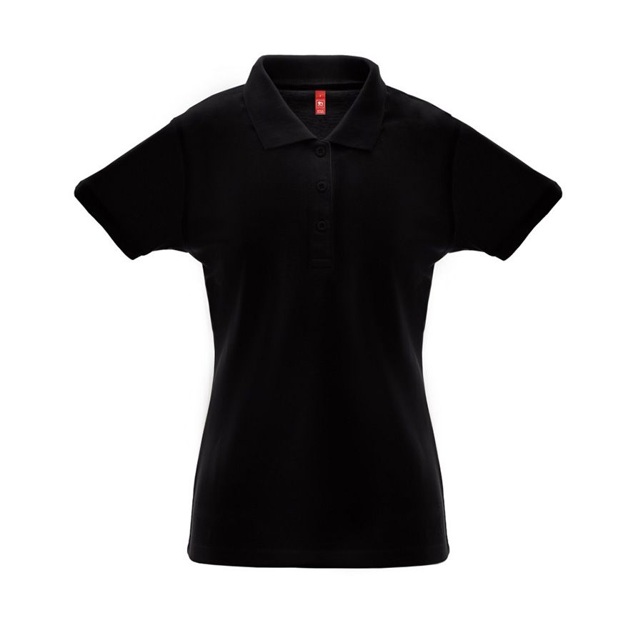 Женская рубашка-поло из смесовой ткани-пике. Полотно футболки упругое и гладкое благодаря обработке ферментами "enzyme wash" и сохраняет форму при стирке. Модель полуприлегающего силуэта. Благодаря манжете из риба 1х1 рукав смотрится очень аккуратно. Воротник также выполнен из риба 1х1, внутри ворота - укрепляющая тесьма по горловине. Планка с 3 пуговицами в тон изделия. запасная пуговица на ярлыке во внутреннем боковом шве.Цвет, близкий к Pantone Black