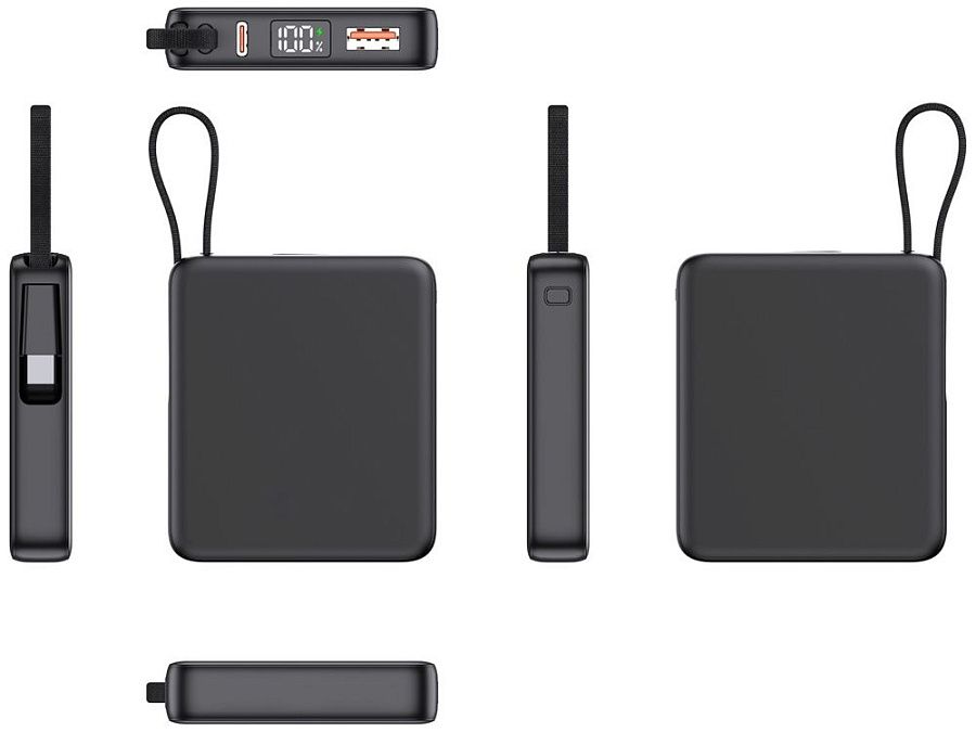 - Встроенный кабель Type-C и он же петелька для переноски: Современный стандарт Type-C, подходящий для зарядки всех последних популярных смартфонов, включая iPhone. Кабель также выполняет роль удобной петельки