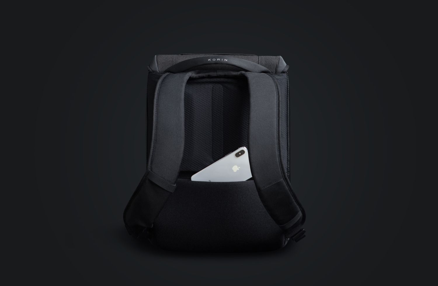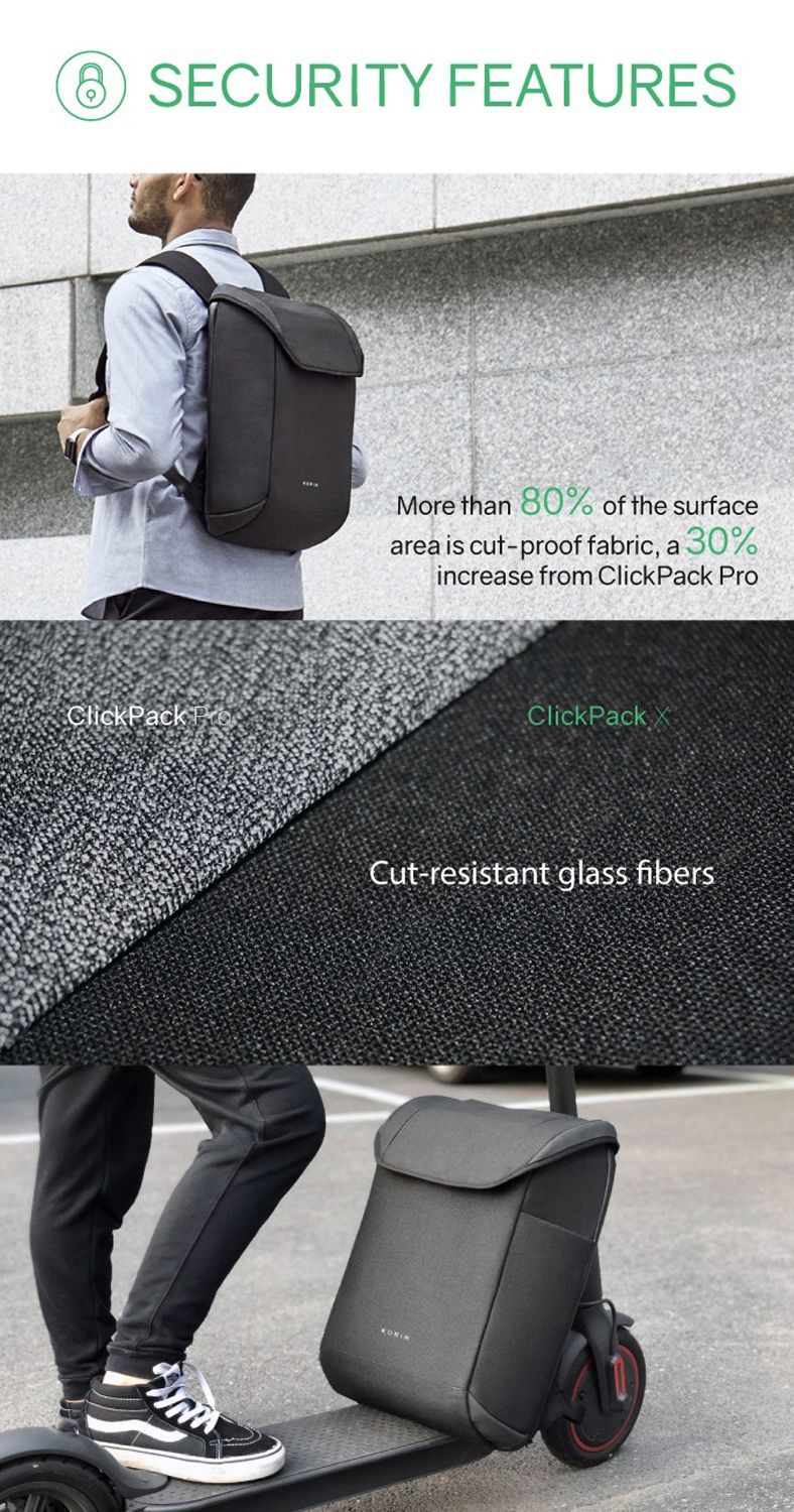 Вместительный городской рюкзак ClickPack X черного цвета, обладатель премии iF Design Award 2020. Размер рюкзака 45х32х15,5 см, объем 18 л, вес 1200 гр. Сделан из свехпрочного устойчивого к порезам и трению водоотталкивающего полиэстера многослойного плетения. Сочетание полиэстера и стекловолокна защищает от порезов ножом или другими острыми предметами. Конструкция достаточно жесткая, не деформируется. Детально продуманная организация отделений позволяет грамотно распределить вес. Самые тяжелые предметы располагаются ближе к спине, например, в отделении размером 34х28х3 см для ноутбука диагональю до 15,6” с дополнительным карманом размером 18х24 см для планшета диагональю до 8” или мелких вещей. Благодаря плотным перегородкам ноутбук надежно фиксируется и не перемещается при ходьбе. Специальная анатомическая конструкция снижает нагрузку на плечи и спину, и вес рюкзака воспринимается на 20-25% легче, чем при использовании стандартных моделей рюкзаков. Вентилируемая спинка с мягкими анатомическими вставками и дополнительной защитой поясничного отдела позвоночника. Конструкция рюкзака позволяет открывать его под углом 30° или распахнуть полностью на 180°. Если необходимо достать какие-то мелочи, достаточно зафиксировать липучки для вертикального открытия на 30°, а для того, чтобы аккуратно уложить в рюкзак много различных предметов, просто положите его и раскройте на 180°. Дополнительно в основном отделении расположены еще 5 карманов различного функционала. 2 кармана размерами 13х22 см и 14х22 см на молниях и 3 открытых кармана под мелочи, в один из которых размером 16х10 см можно поместить powerbank, т к в него приходит USB-кабель, соединенный с портом на внешней стороне рюкзака для легкого подключения к смартфону. Это оригинальная запатентованная система зарядки K EasyCharging 3.0 нового поколения с помощью USB-порта, расположенного в лямке рюкзака, и кабеля, идущего к powerbank, что делает мобильную зарядку более удобной. С внешней стороны рюкзака сбоку есть специальный водозащищенный карман размером 14х11 см. В него можно поместить бутылку с водой или зонт. Рюкзак закрывается на водонепроницаемую молнию YKK, которую можно зафиксировать с помощью кодового замка TSA007 с функцией таможенного досмотра. После этого рюкзак закрывается клапаном, фиксирующимся магнитным замком с системой SNAP. На клапане расположен easy access карман с магнитной застежкой. На правой лямке рюкзака находится USB-порт, на левой - easy access карман для карточек. На обеих лямках с удобной новой системой регулировки и фиксации пряжек есть петельки, за которые можно прицепить очки или проводные наушники. На спинке рюкзака расположен внешний потайной карман на магнитной застежке размером 14х28 см. Над ним есть дополнительная лямка, за которую можно закрепить рюкзак на выдвижной ручке чемодана. В дополнение к вышеперечисленным средствам защиты рюкзак ClickPack X оснащен стальным тросом, которым можно обхватить неподвижный предмет и затем зафиксировать бегунком молнии в кодовом замке. Сверху расположена специальная ручка, за которую при необходимости удобно нести рюкзак в руках. На углах клапана рюкзака размещены треугольные светоотражающие элементы черного цвета, отлично вписывающиеся в основной дизайн. В темное время суток они равномерно отсвечивают практически на 360° и делают вас заметными на расстоянии до 100 метро