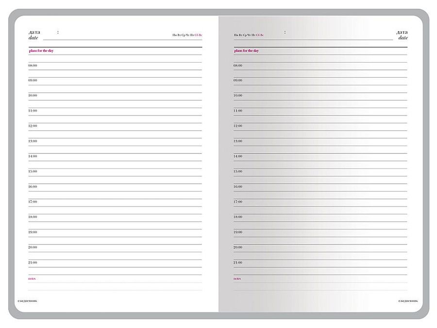 Недатированные страницы в серую линейку имеют отдельное место для проставления числа месяца и дня недели. Справочный блок на 17 страницах содержит полезную информацию из различных областей.