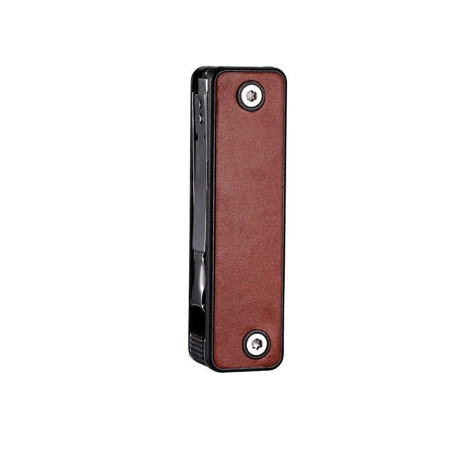 Рукоятка изготовлена из АБС-пластика с кожаными вставками — это определенно добавляет ножу стиля и солидности. Каждый инструмент оснащен функцией блокировки. Детали надежно закреплены в корпусе, что делает использование мультитула удобным и безопасным: чтобы достать нужный инструмент, просто нажмите на кнопку и выдвиньте деталь.Длина лезвия 53 мм.