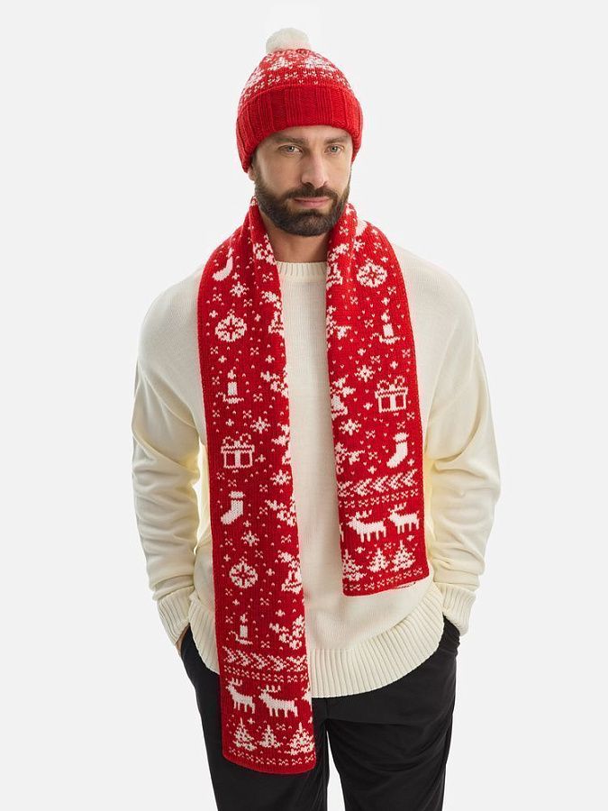 Шарф Holidale выполнен из высокообъемной полушерстяной пряжи, которая дарит тепло и ощущение праздничного уюта. Изысканный жаккардовый узор в традиционных зимних цветах, контрастные сочетания и объемная текстура подчеркивают праздничный характер аксессуара.