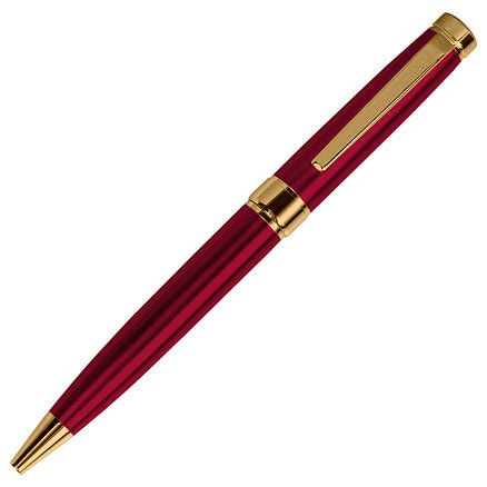 Металлическая шариковая ручка представительского класса с поворотным механизмом. Лаковый глянцевый бордовый корпус, золотистые детали отделки. Корпус ручки разбирается, стержень легко заменить. Стержень с синими чернилами типа Parker. Длина письма 1000 метров. толщина письма 1 мм. Логотип нанесенный методом гравировки будет иметь золотистую поверхность.