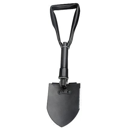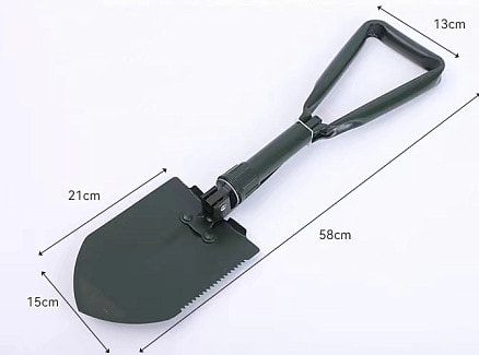 Складной, небольшой размер, легко носить с собой. После разворачивания один конец представляет собой лопату, а другой — кирку. Он сгибается и складывается, а ручку можно использовать как горизонтально, так и вертикально.